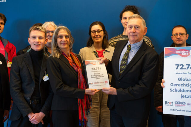 Knapp 73.000 Menschen haben im Rahmen der Kampagne „Erlassjahr 2025 – Turn Debt into Hope!“ Reformen der internationalen Finanzarchitektur und echte Schuldenstreichungen für Staaten des Globalen Südens gefordert – und den Appell an das Bundesfinanzministerium übergeben.